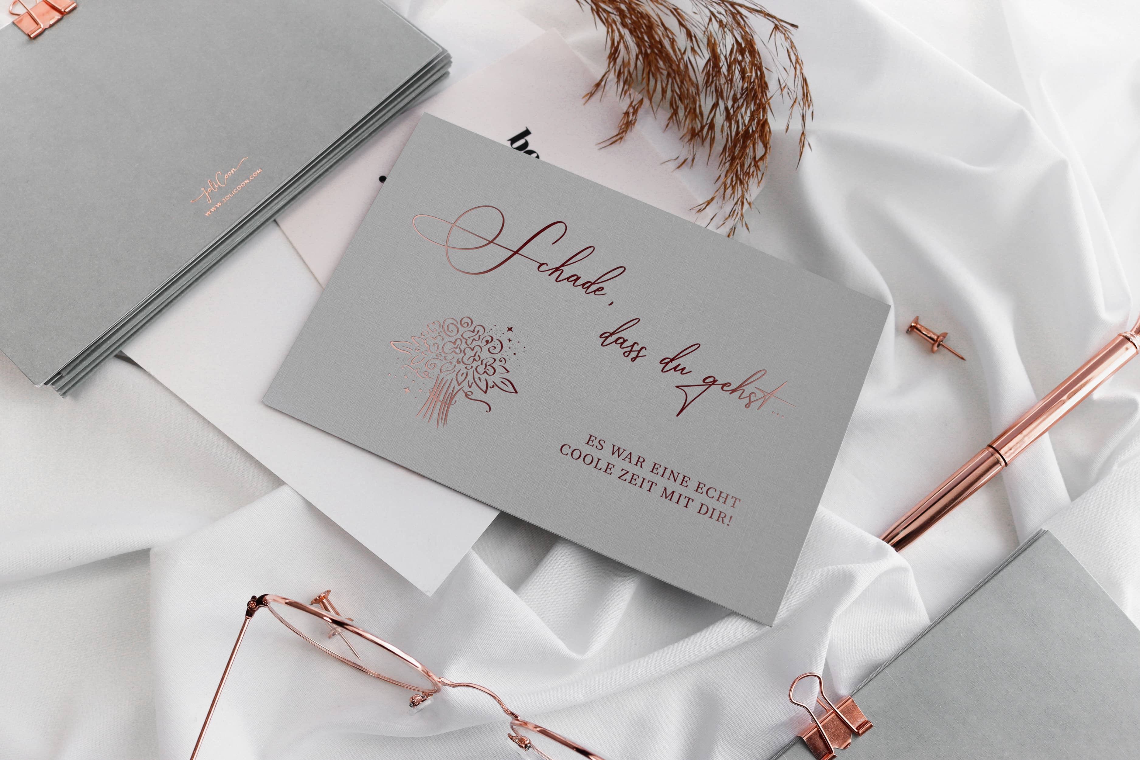 Ein Abschied ist nicht nur das Ende einer gemeinsamen Zeit, sondern auch der Beginn von etwas Neuem. Eine handgeschriebene Karte von JoliCoon erinnert daran, was bleibt: gemeinsame Erlebnisse, Lachen im Büro, kleine Gesten, die den Alltag besonders gemacht haben. Sie wird zu einem Erinnerungsstück, das auf dem Schreibtisch oder im Regal ihren Platz findet und immer wieder ein Lächeln hervorruft. Ob für den Kollegen, der in den Ruhestand geht, oder die Kollegin, die neue Wege einschlägt – unsere Karten schenken Raum für ehrliche Worte und echte Wertschätzung. So wird aus einem Abschied ein schöner Moment, der verbindet – und zeigt, dass gute Wünsche auch nach dem letzten Arbeitstag weitertragen. Möchtest du deinen Abschiedsworten für Kolleginnen oder Kollegen eine besondere Note verleihen? In unserem Blog findest du liebevolle, humorvolle und herzliche Sprüche speziell für Abschiedskarten: Abschied Kollege/Kollegin – herzliche & lustige Sprüche für Karten