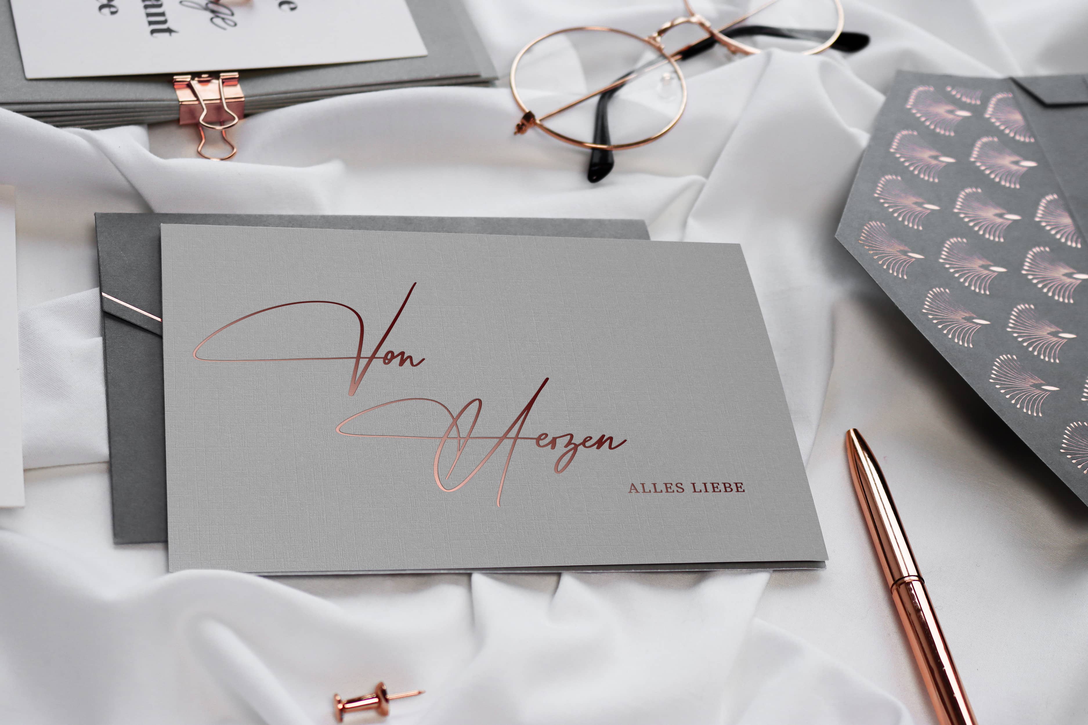 Nous aimons nos cartes de vœux, invitations et messages divers pour les amis, la famille et les connaissances. Pour nous assurer que vos mots aimables sont emballés dans le plus beau design, nous mettons beaucoup d'efforts dans la conception et la sélection du papier pour nos produits. De nombreux motifs sur nos cartes pliantes sont écrits à la main et imprimés avec un marquage à chaud. Nous concevons nos cartes avec élégance et simplicité et évitons le kitsch et le plastique inutiles. En plus de nos cartes pliantes, l'environnement est également très important pour nous. Tous nos produits sont totalement neutres pour le climat et sont fabriqués en Allemagne. De plus, nous utilisons des encres d'impression organiques végétaliennes qui sont totalement exemptes d'huile de palme et de tests sur les animaux. Ainsi, vous pouvez envoyer un rappel spécial sans mauvaise conscience.